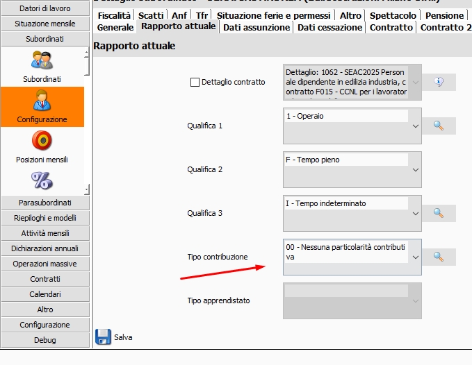 In particolare, è possibile eseguire questa operazione nella scheda "Dati previdenziali" della voce Configurazione del menu Subordinato.